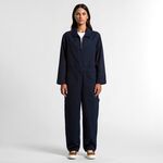 100% Cotton Duck canvas, Collared all-in-one, adjustable shoulder straps, YKK zip front, 6 pockets, top stitch detailing, Elastic at center back, hammer loop, zip close chest pocket, internal access at pocket, double patch knees